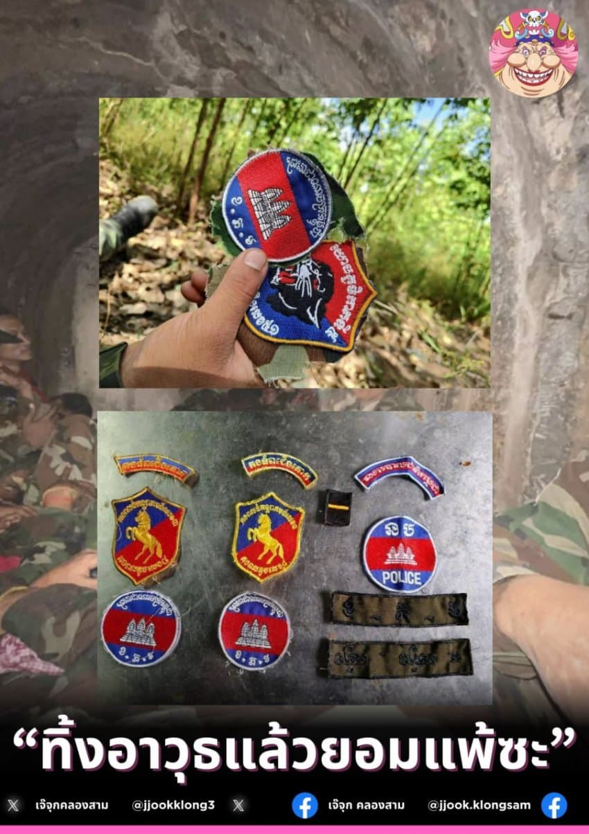 캄보디아군 사살 전리품을 자랑하는 태국군인  |